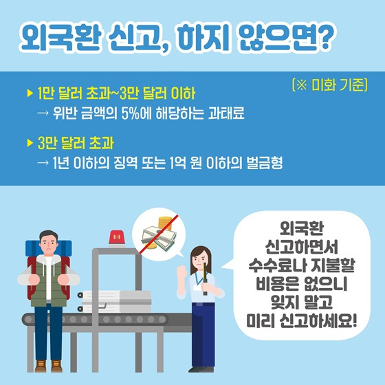 - 3만 달러 초과 미신고: 1년 이하 징역 또는 1억 원 이하 벌금