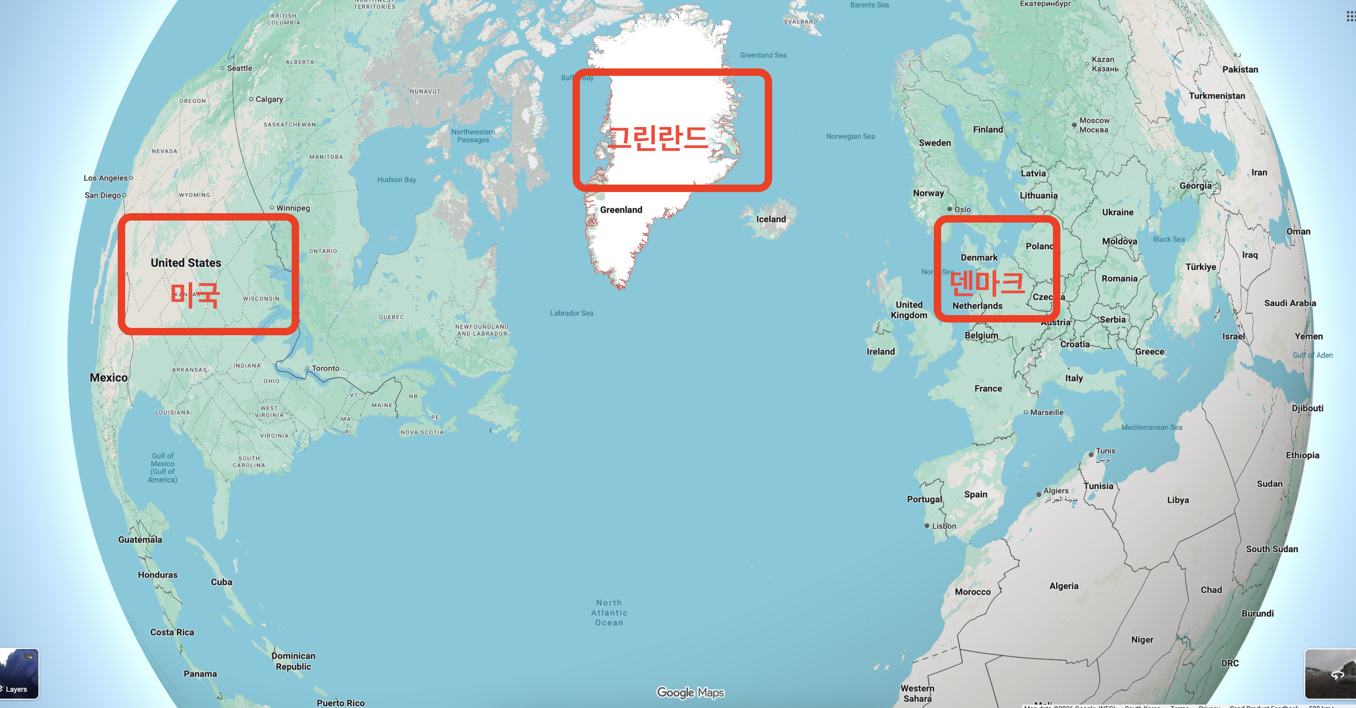 2. 미국, 그린란드, 덴마크 지도 위치