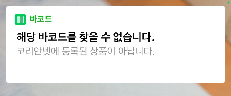 모든 제품에는 바코드가 있으니까, 바코드만 있으면 모든 상품을 저렇게 검색해볼 수 있지 않을까 해서 집에 있는 제품 하나를 검색해봤더니 아래와 같이 메시지가 떴다.
