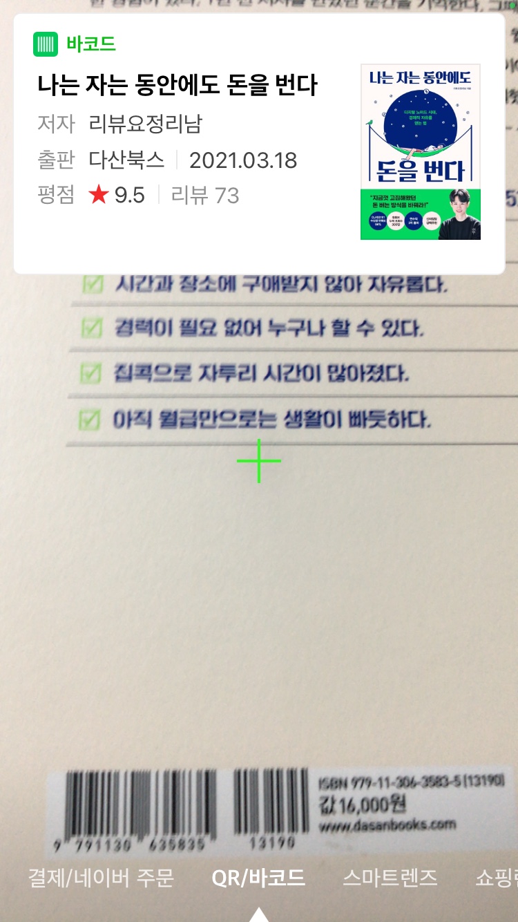 그러면 바코드를 인식할 수 있는 상태가 되면서 초록색 십자가 모양이 보인다. 이 때 곧장 책 겉표지에 있는 바코드에 스마트폰을 갖다댄다.