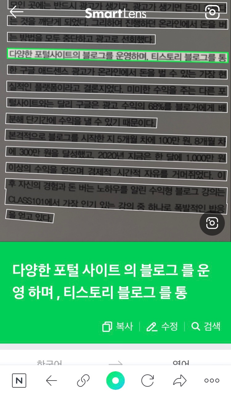 물론 스마트렌즈가 온전히 정확하지는 않으니 한번 확인은 해봐야겠지만, 만약 분량이 많을 경우에는 정말 편리하지 않겠어요?^^