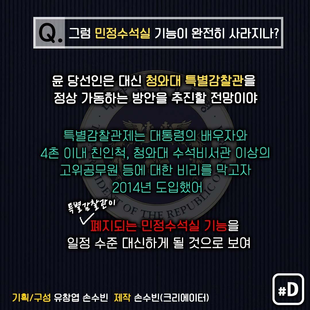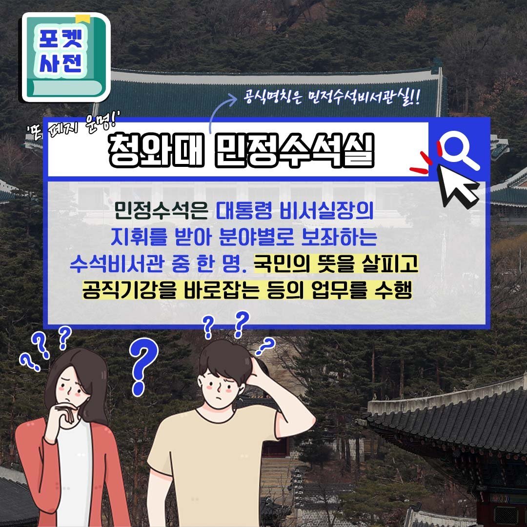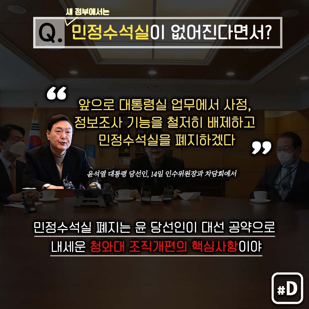 윤석열 대통령 당선인이 청와대 민정수석실을 폐지하겠다고 밝혔는데요. 민정수석실, 도대체 어떤 일을 하는 조직인지 궁금해서 알아봤습니다. 민 정 수 석 "민정, 공직기강, 법무, 반부패 등의