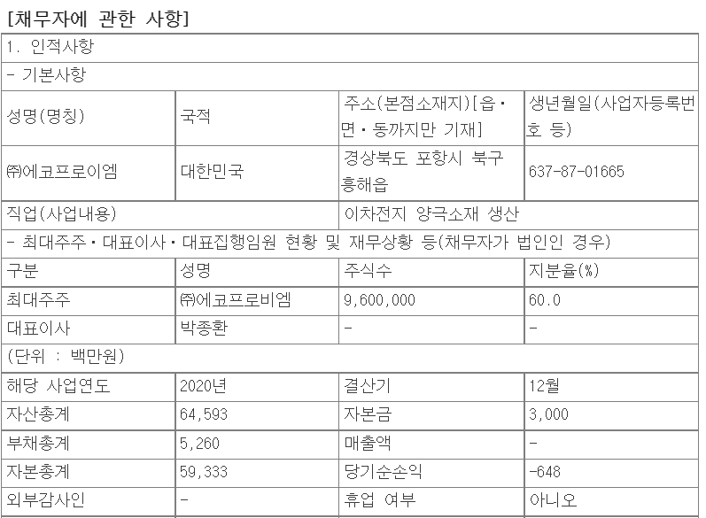 ㈜에코프로이엠은 2020년 2월 ㈜에코프로비엠과 삼성SDI㈜이 합작하여 설립한 법인으로, 차세대 하이니켈계 NCA 양극재를 생산한다.