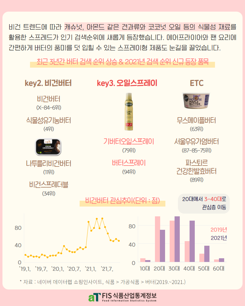 비건을 위한 버터가 있는 줄 몰랐는데 최근 3년간 관련 검색 순위가 상승했다고 한다. 식물성유기농버터, 나투를리, 비건스프레더블 등이 검색어에 올랐다.