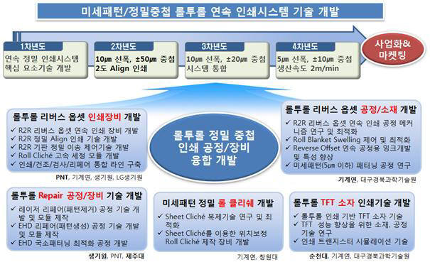 최종 목표는 유연전자소자 핵심 요소인 유연기관 전자회로 금속배선을 직접 형성할 수 있는 정밀 미세패턴(5미크론 이하), 다층 회로 구성을 위한 고중첩정밀도(±10미크론) 성능을 만족하는 롤투롤 연속·다층 정밀 인쇄시스템 기술 개발이다.
