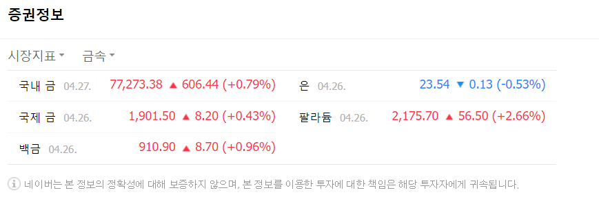 네이버에 '원자재값'이라고 검색어를 넣으니 위와 같이 간단하게 확인할 수 있는 정보가 뜬다.