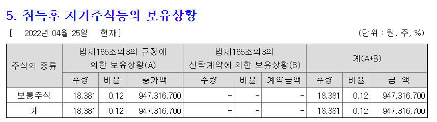 -보통주 18,381주(9억7천만원)를 취득했고, 취득목적은 [종업원에 대한 상여금 지급]이다.