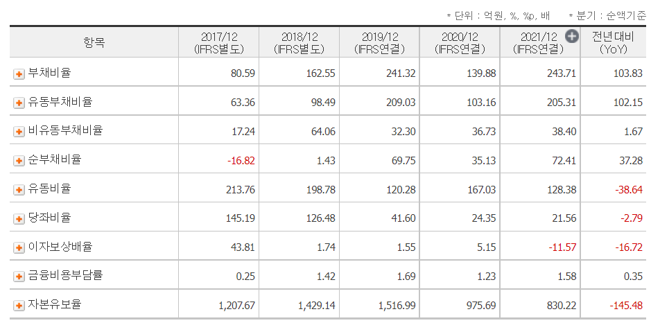 이자보상배율은 2017년도에 상당히 높았으나, 급격히 낮아졌고 좀 오르다가 작년에는 마이너스 11.57을 찍었다...