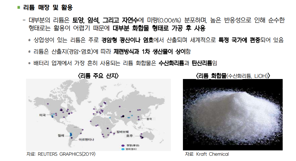 현재 암석과 염호에서 리튬을 채굴해서 수산화리튬이나 탄산리튬으로 생산하는 기술은 중국 기업이 주로 보유하고 있단다.