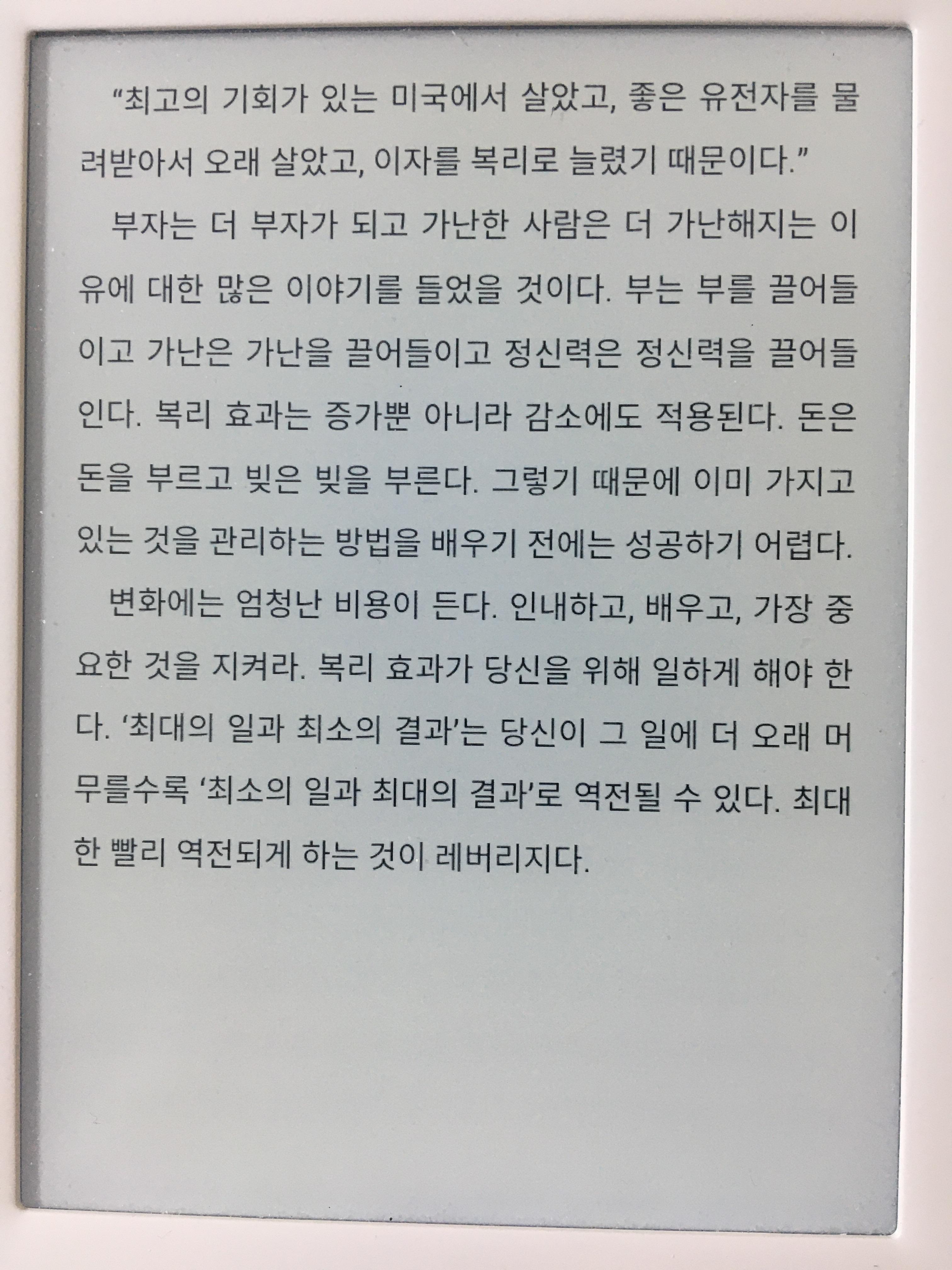 경제 관련 유튜브 채널에서 하도 추천을 해서 읽어보게 됐는데, 아니었다면 더 미뤘을 것이다. 레버리지라지만 넓은 범위로 확장시키면 자기계발서에서 읽어온 내용과 겹치는 내용도 보인다.