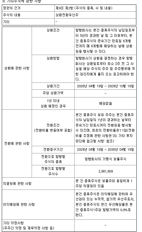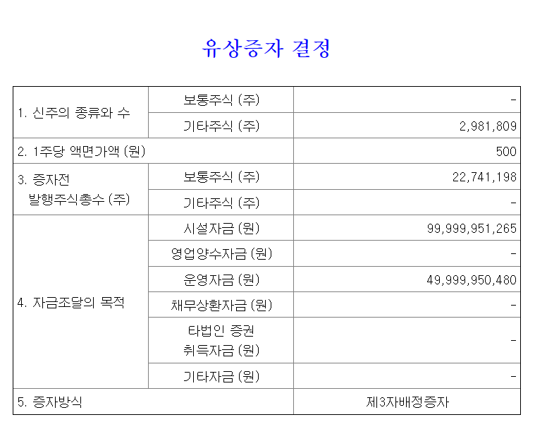 증자방식은 5번 증자방식에서 '제3자배정증자'라는 걸 알 수 있다.