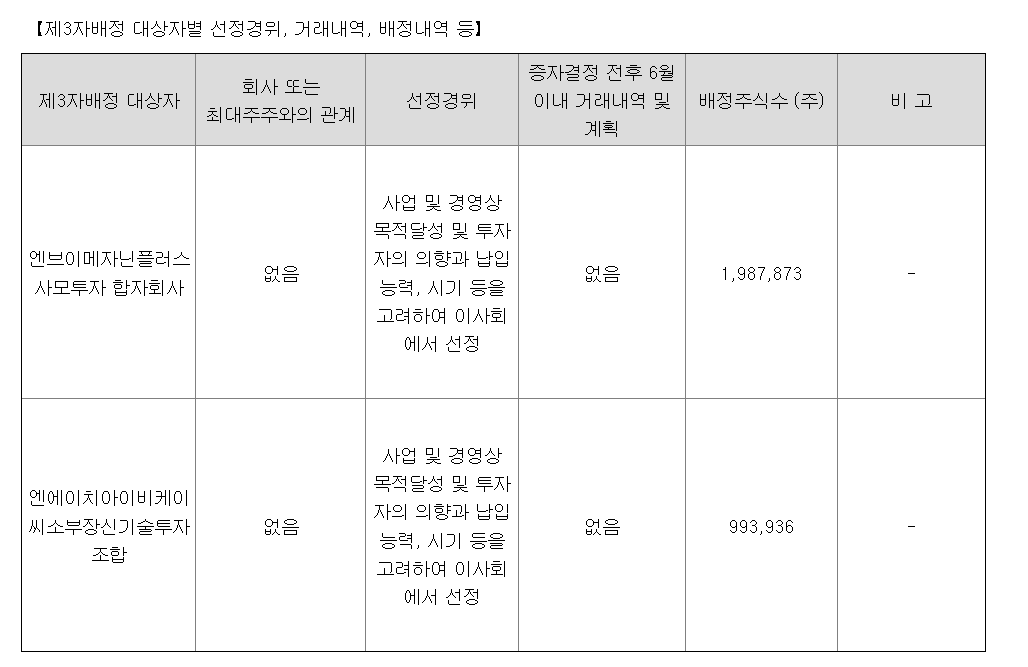 제3자배정 대상자는 엔브이메자닌플러스 사모투자 합자회사, 엔에이치아이비케이씨소부장신기술투자조합으로, 선정 경위는 '사업 및 경영상 목적달성 및 투자자의 의향과 납입 능력, 시기 등을 고려하여 이사회에서 선정'이다.