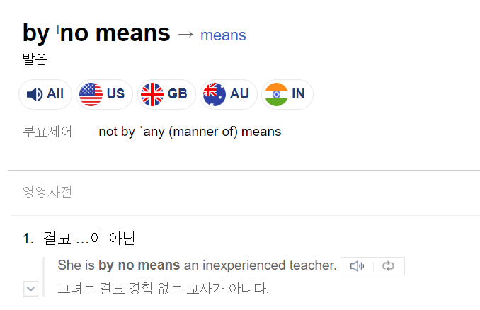 by no means는 대략 무슨 뜻인지는 알겠는데 문장에서 어디다 끼워넣으면 되는지 감이 오지 않는다. 다양한 문장을 좀 더 접해봐야지 활용할 수 있을 것 같은데, 생겨먹은 형태가 조금 낯설어서인 것 같다.