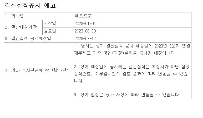 결산 대상 기간은 2023년 상반기이며, 공시예정일은 돌아오는 수요일인 2023-07-12 이다. 이날 공시되는 결산 실적은 확정치가 아닌 잠정 실적이다.