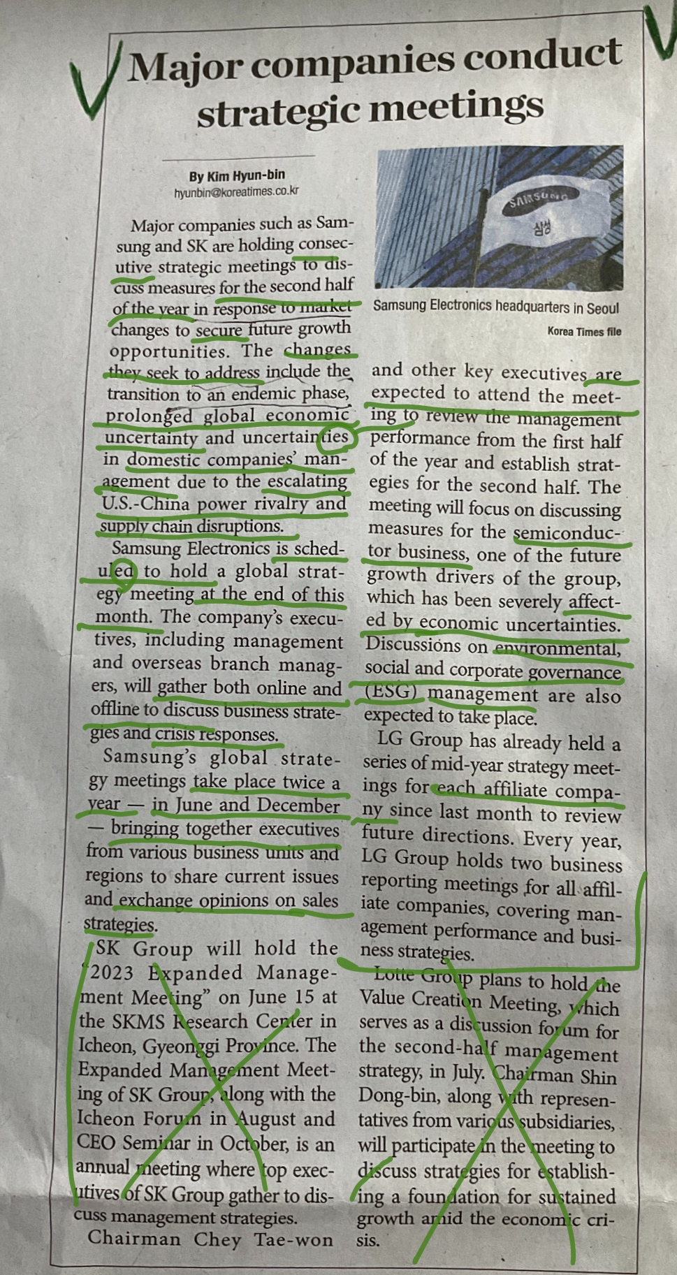 => 삼성, SK 등 주요 기업들은 미래 성장 기회 확보를 위해 시장 변화에 대응한 하반기 대책을 논의하는 전략회의를 연이어 개최하고 있다.