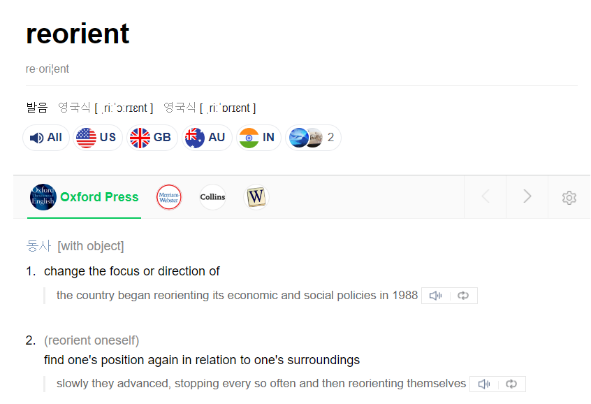 Reorient는 O에 강세가 있다. 어렵지 않은 단어임에도 강세를 모르면 알아듣지 못할 수 있겠다.