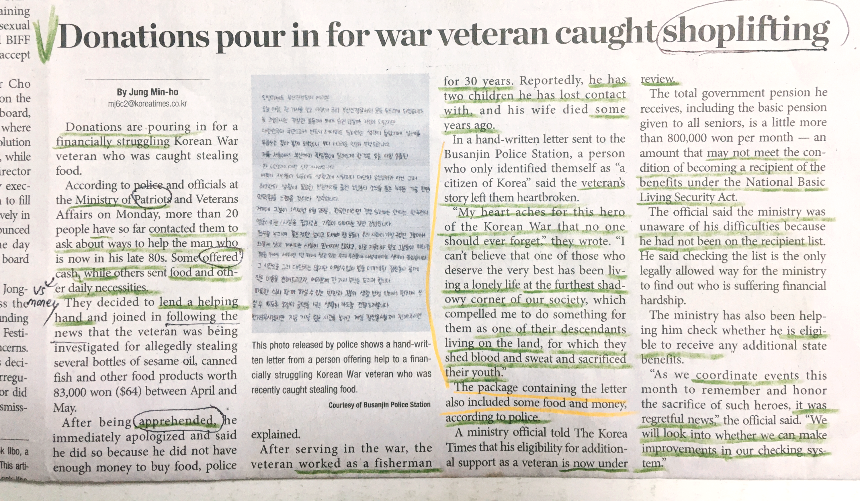 한국전쟁 참전용사가 생계가 어려운 상황에 놓이면서 먹을 것을 훔치다가 (shoplifting) 붙잡혔는데, 이 사연을 알게 된 시민들이 그를 도울 방법이 없을까 해서 음식도 보내고 돈도 보내고 했다는 기사다. 보훈처도 이 분을 지원할 방법을 찾아보고 있다고 한다.