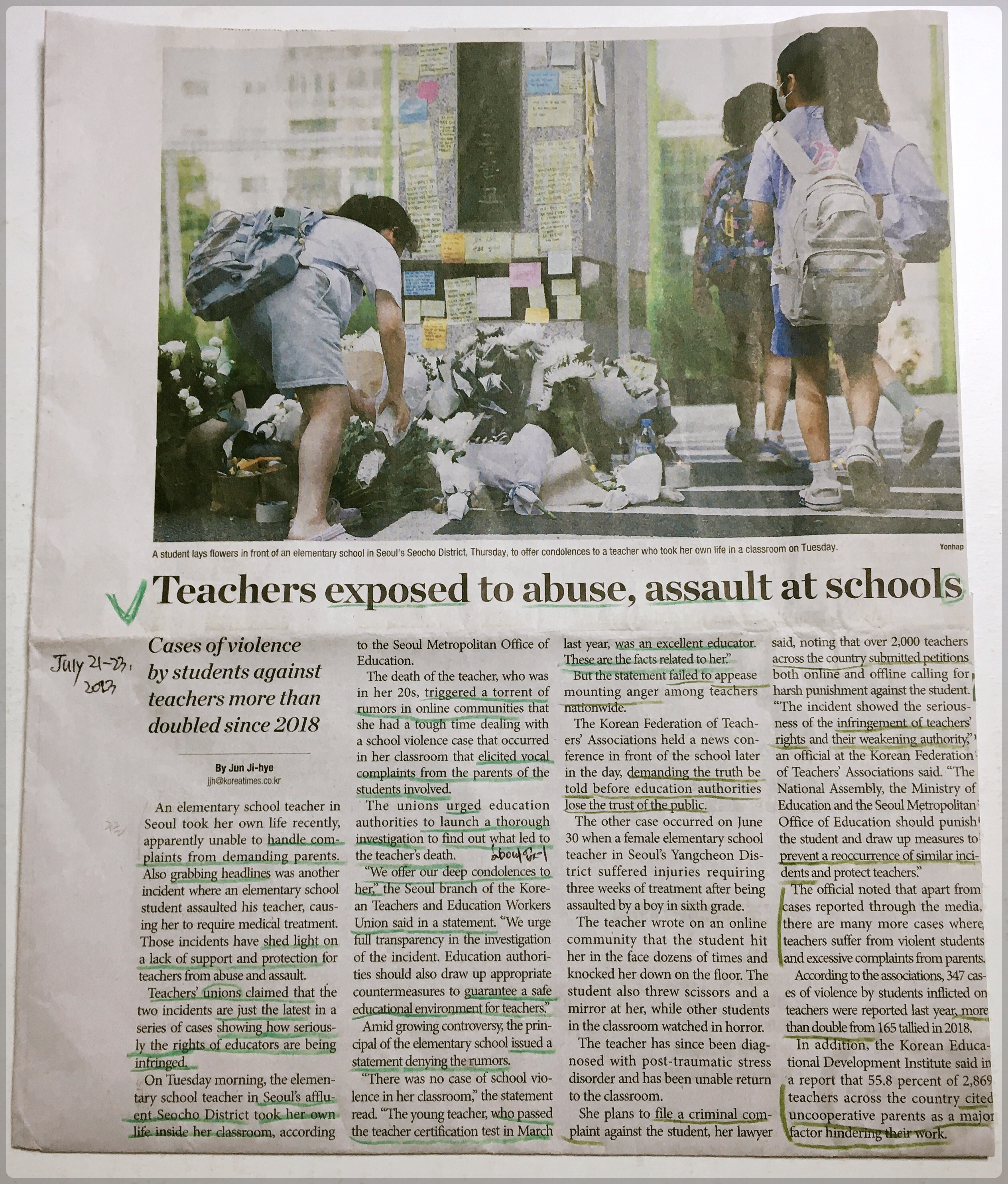 July 21-23, 2023 - The Korea Times 폭언과 폭행에 무방비로 노출된 교사들