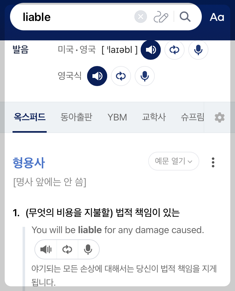 liable이 익숙하지 않은 단어이지만, 문장에서 쓰임을 눈여겨보다보면 기억에 도움이 될 거라고 믿는다.