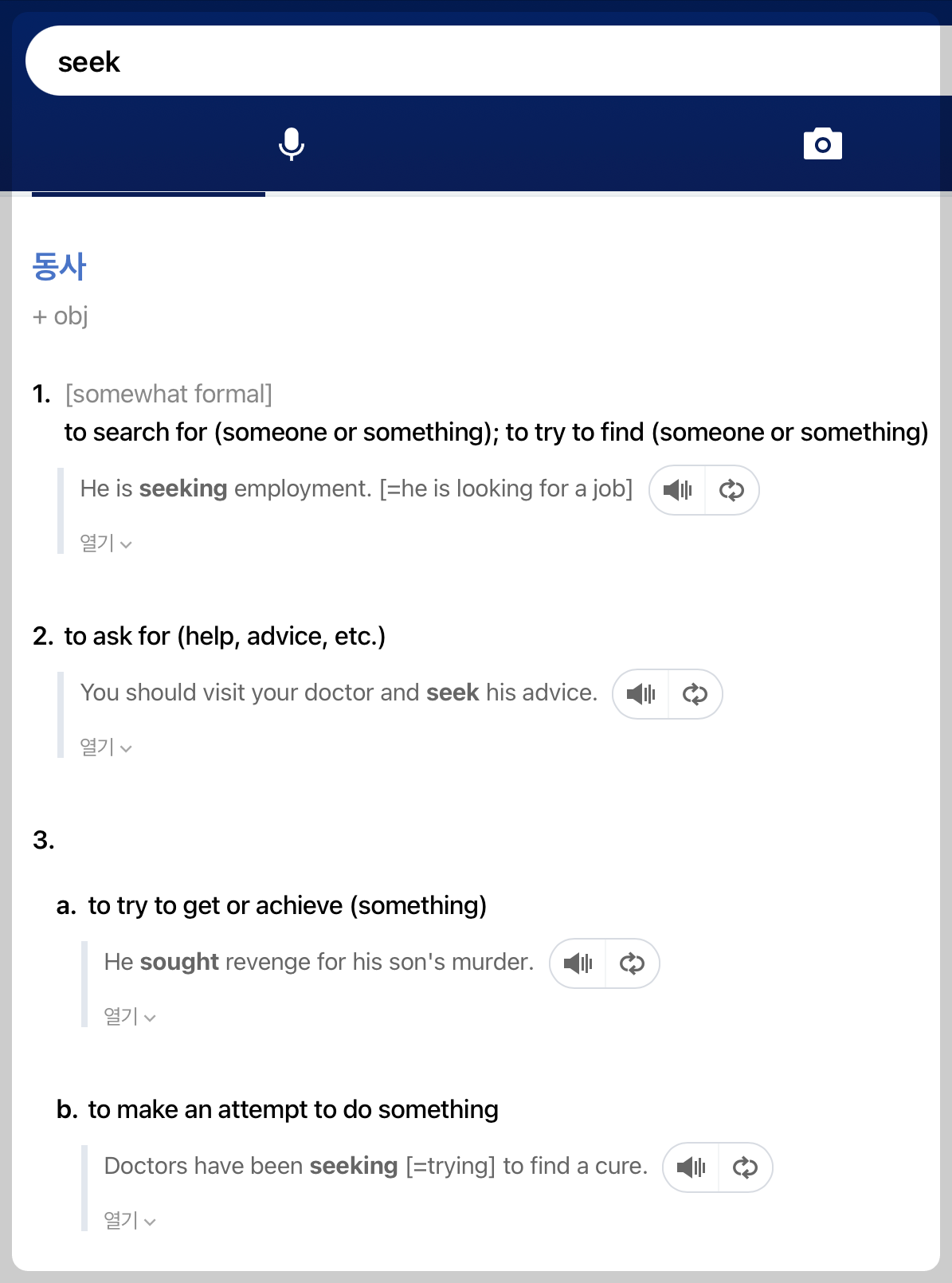 seek에 추구하다라는 뜻이 있는 건 알았는데 찾다라는 뜻이 있는 줄은 몰랐다.