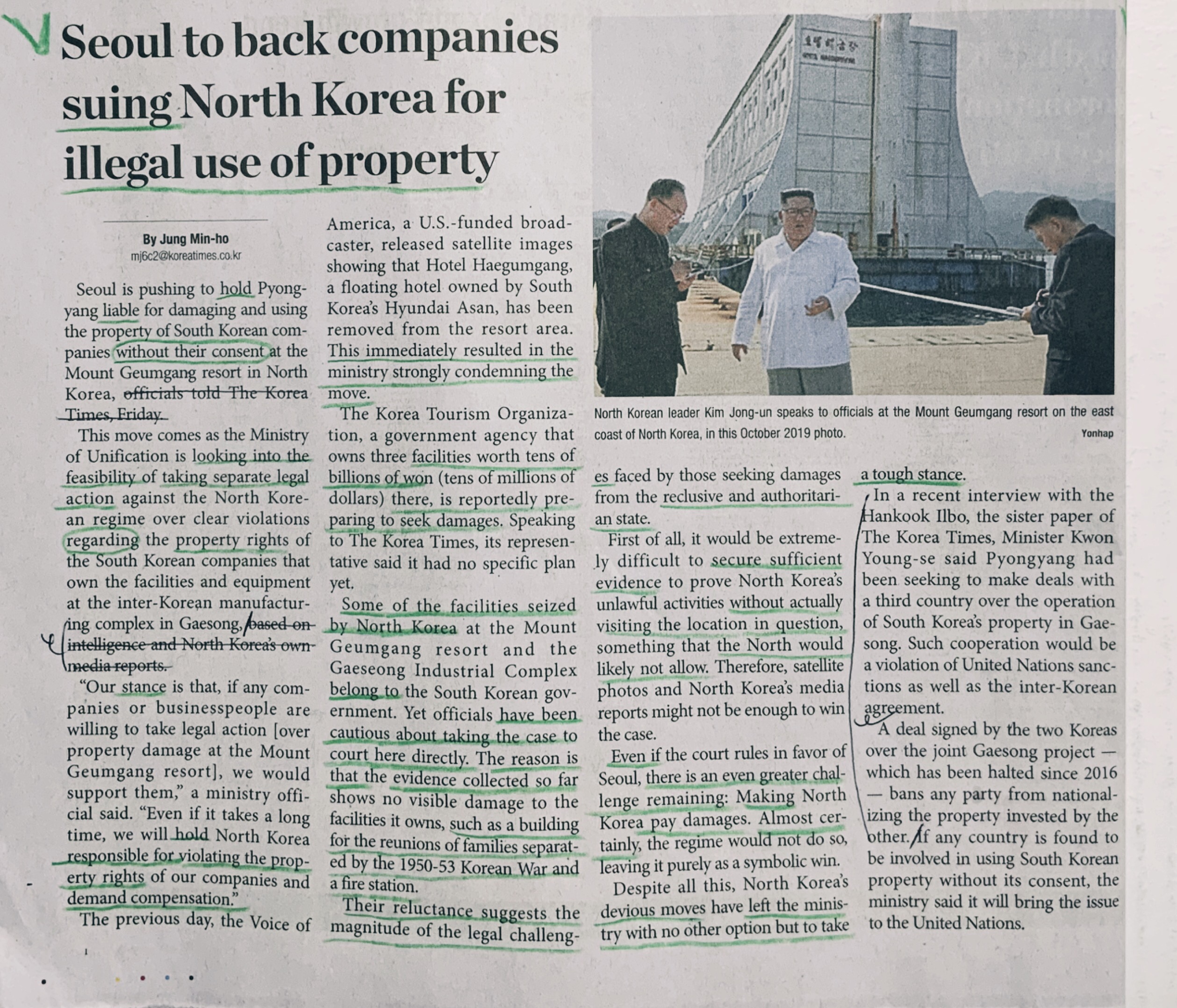 => 한국 정부는 북한의 금강산 휴양지에서 남측 기업의 재산을 무단으로 훼손하고 사용한 것에 대해 평양에 책임을 묻도록 추진하고 있다고 관리들이 금요일 The Korea Times에 말했습니다.
