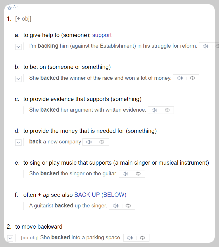 제목 'Seoul to back companies suing North Korea for illegal use of property' 에서 동사 back이 '(남한으로) 되돌아오게 하다'라는 뜻인가? 싶었는데 사전을 찾아보고 동사 back의 뜻을 새로 배웠다.