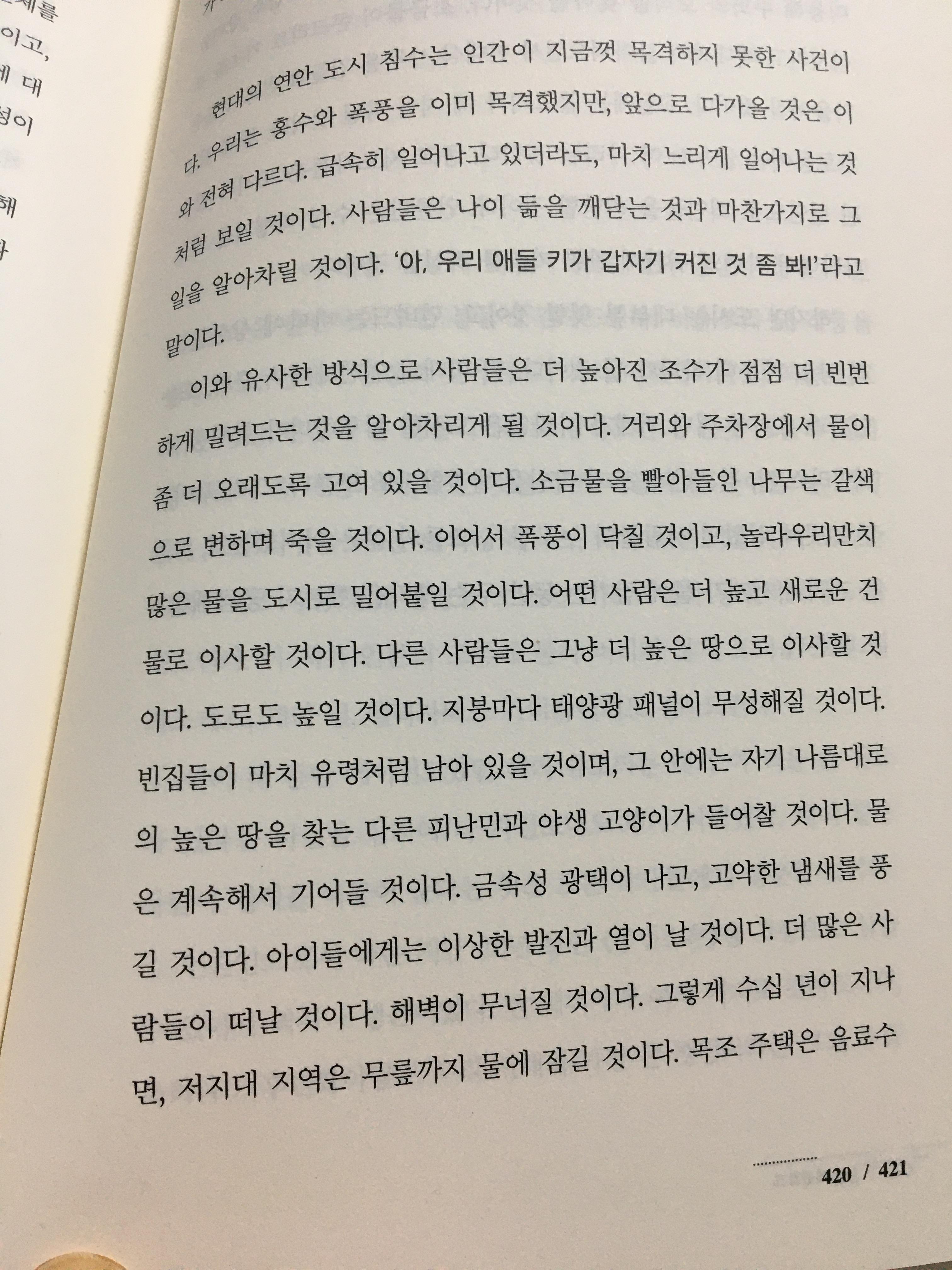 머리속에 이렇다하게 기억에 남는 게 없을 것 같아서 여기에 기록을 해두지만, 분명하게 기억에 남는 건 해수면 상승이 진행중이고, 현재 우리가 너무 안일하게 대처하고 있는 것 같다는 자각이다. 이런 현실을 다시 펼쳐보고 싶지 않지만 그래도 정리를 해본다.