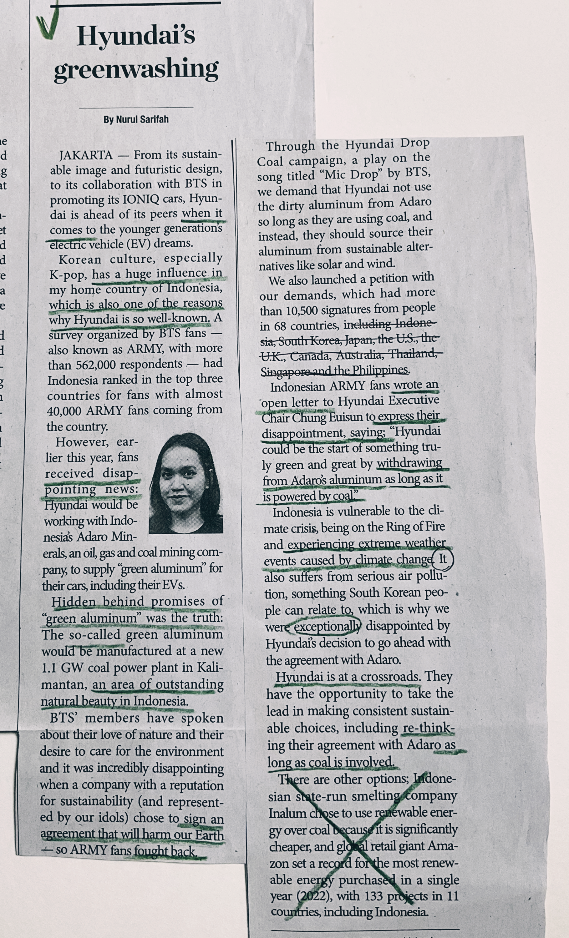 Through the Hyundai Drop Coal campaign, a play on the song titled "Mic Drop" by BTS, we demand that Hyundai not use the dirty aluminum from Adaro so long as they are using coal, and instead, they should source their aluminum from sustainable alternatives like solar and wind.