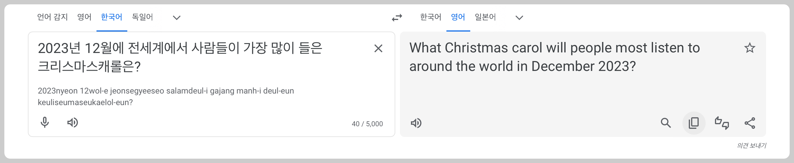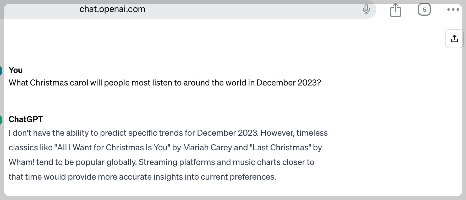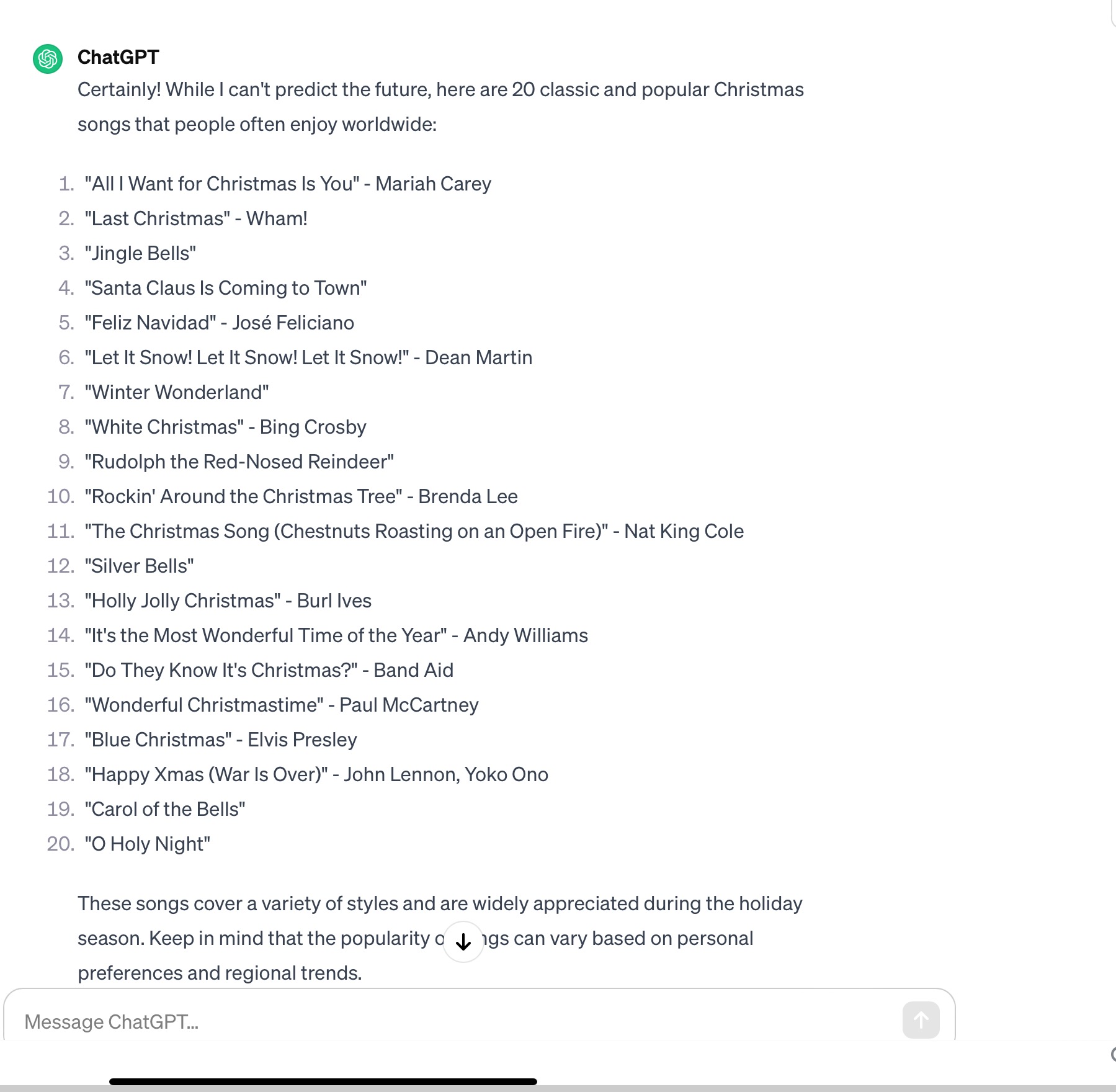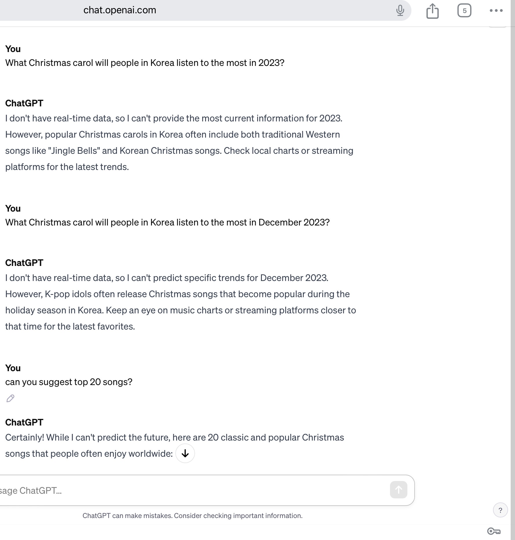 처음에 대한민국에서 2023년에 가장 사람들이 많이 듣는 캐롤을 물었더니 실시간 데이터를 가지고 있지 않다면서 정보를 줄 수 없다고 했다. 그러면서 징글벨이 인기있는 곡중 하나라고 했다( 콧웃음 나옴. 그게 언제쩍 노래야. 애들도 안 들을 거 같은데)