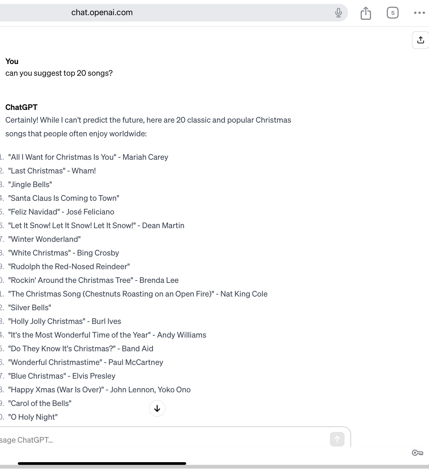 챗GPT를 최근에 다운받아서 해보고 있는데 문득 올해 가장 인기있는 캐롤을 물어보면 알려줄지 궁금해서 실제로 해봤다.