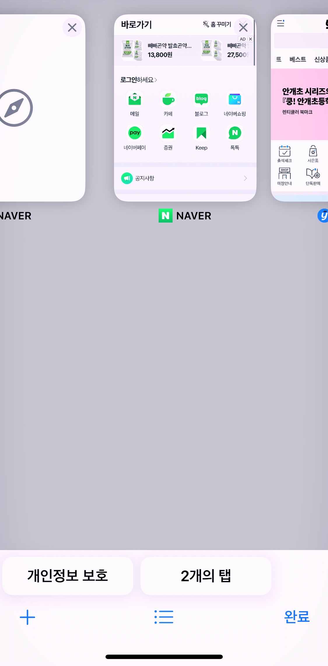 하단에 보면 (개인정보 보호) 탭이 글씨가 일부 가려져 보이고, 그 옆에는 (2개의 탭) 이라는 탭이 보인다.