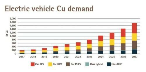 전기 자동차가 가솔린 차량보다 구리를 약 4배 더 많이 사용하기 때문에 코로나 이후 경제의 '녹색' 변화가 구리 및 기타 비금속에 대한 더 높은 수요를 뒷받침하면서 구리가 새로운 오일로 청구되고 있습니다. 국제 구리 협회(International Copper Association)는 EV의 급속한 증가로 EV의 구리 수요가 2017년 185,000톤에서 2027년 174만 톤으로 증가할 것으로 추정합니다.