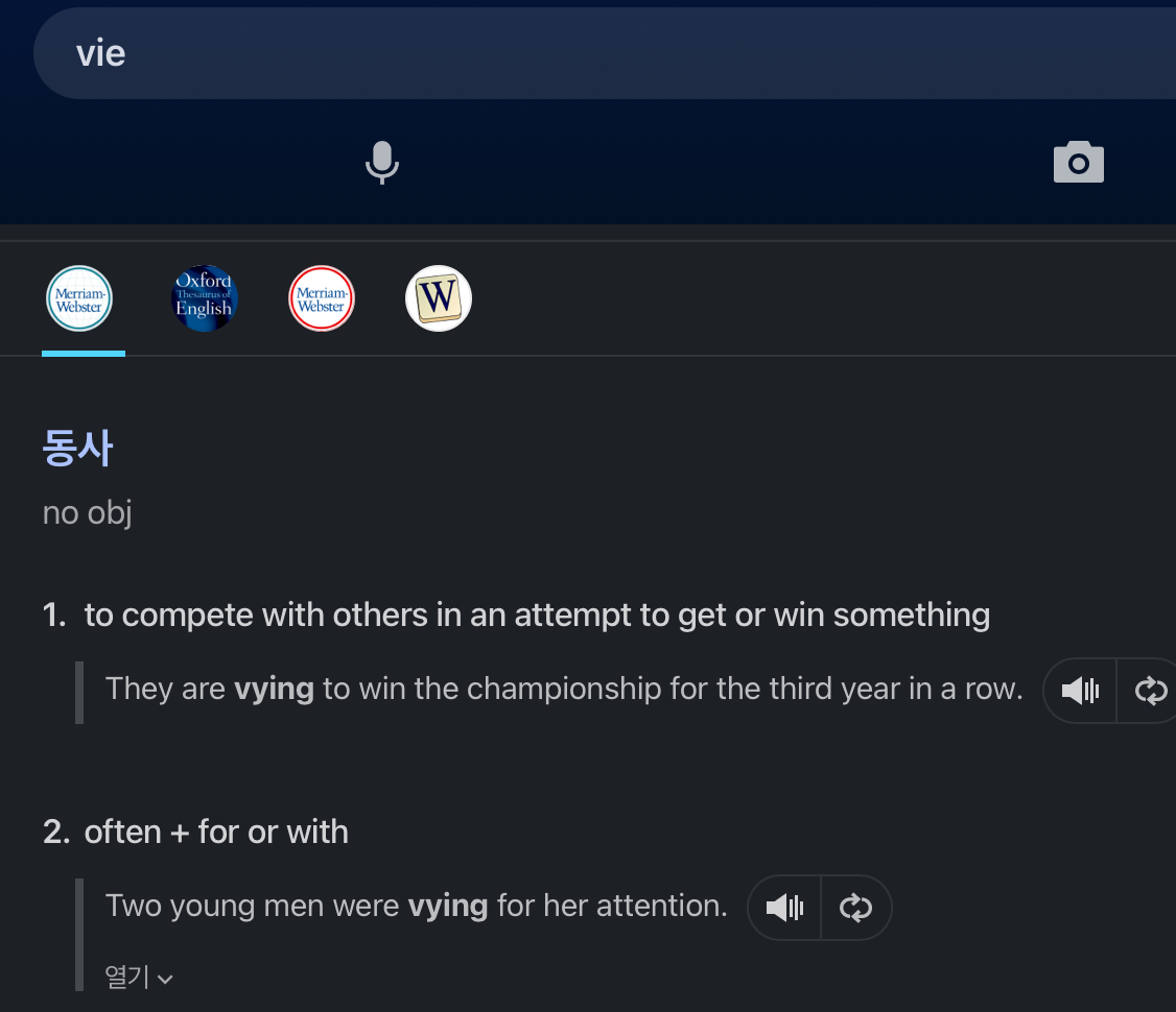 => vying의 원 동사는 vy 가 아니고, vie다.