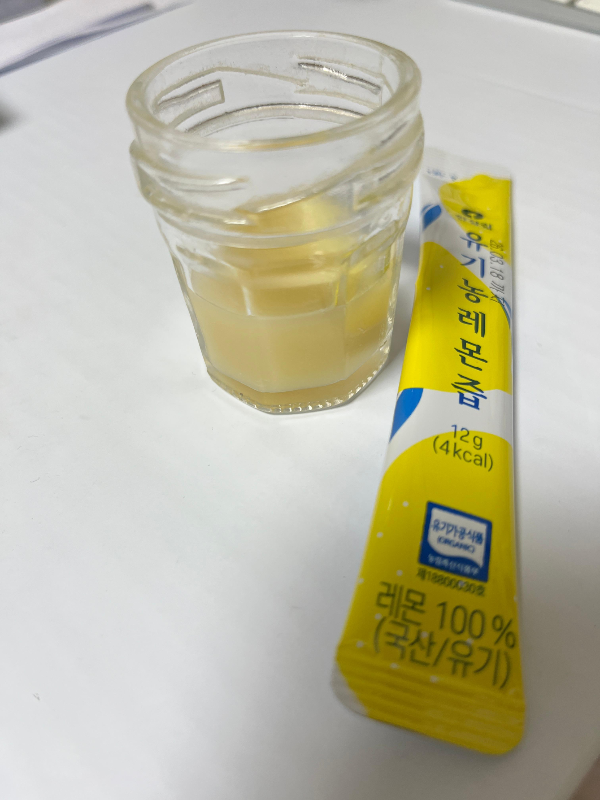 레몬즙을 소주잔 정도 크기 잔에 따라봤다.