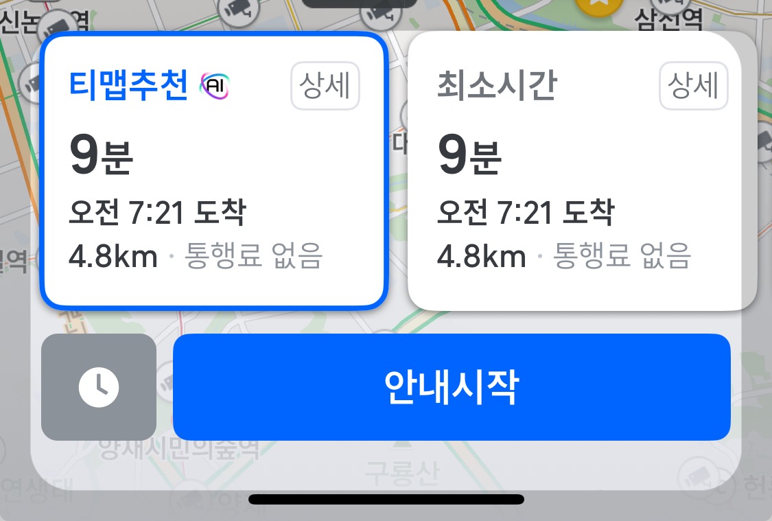 2. 목적지까지 갈 수 있는 몇 가지 코스 중 '티맵추천' 길로 간다고 가정해보겠습니다.