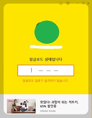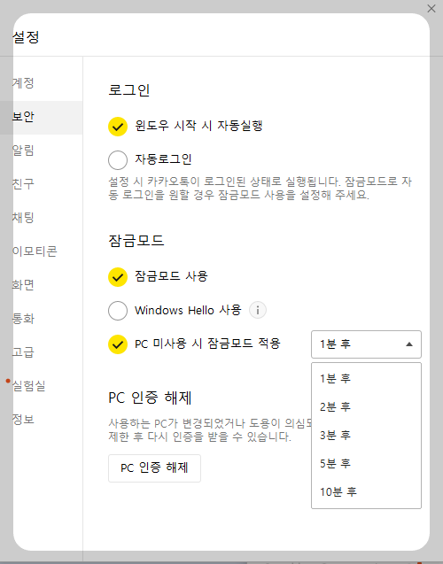 피씨를 켜둔 후 카톡을 사용하지 않을 때, 1분후, 2분후 .- 이런 식으로 몇 분후에 잠글지도 설정할 수 있어요.