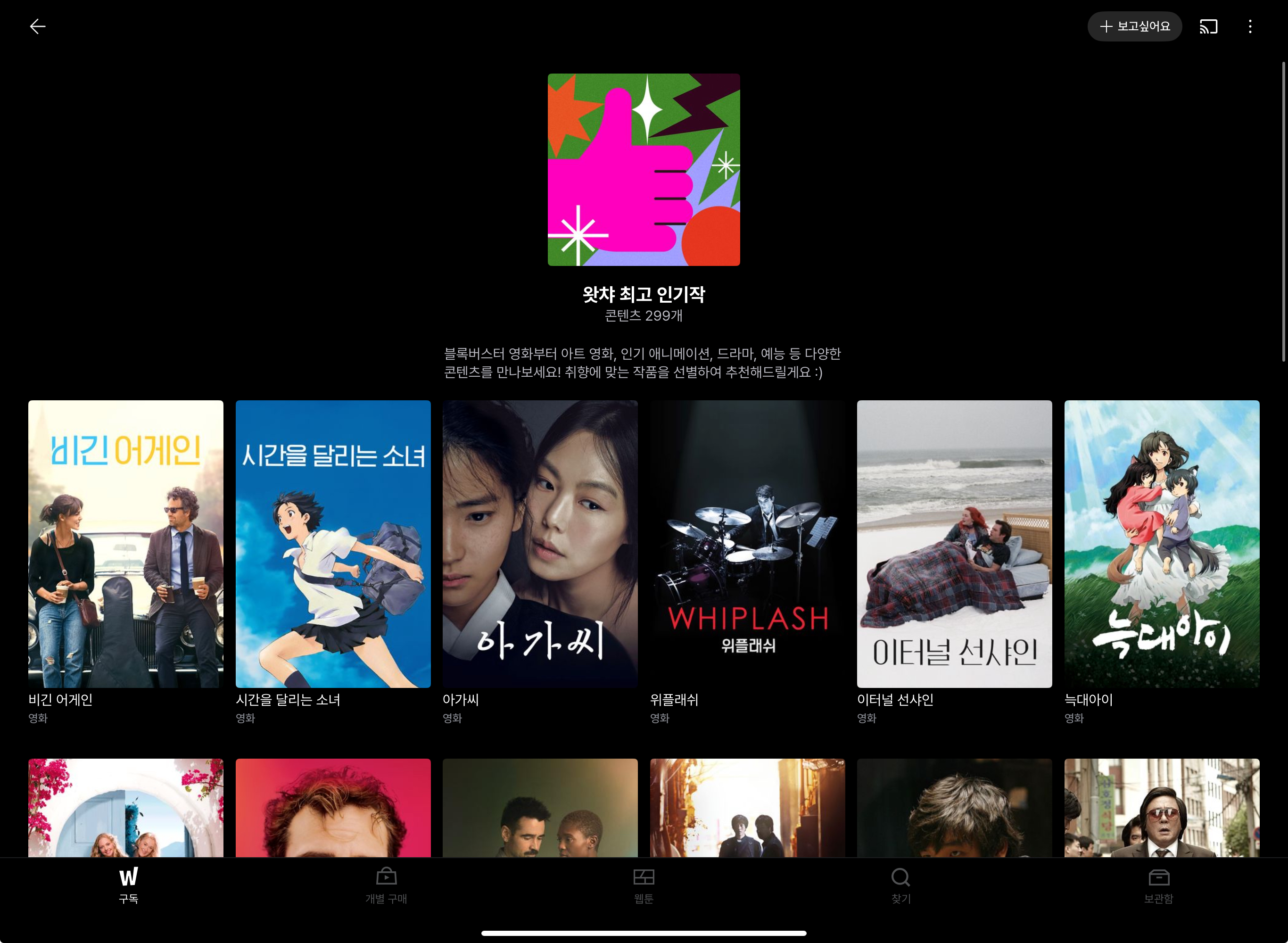 링크에 가셔서 왓챠 최고 인기작에서 작품을 추가로 골라보세요!