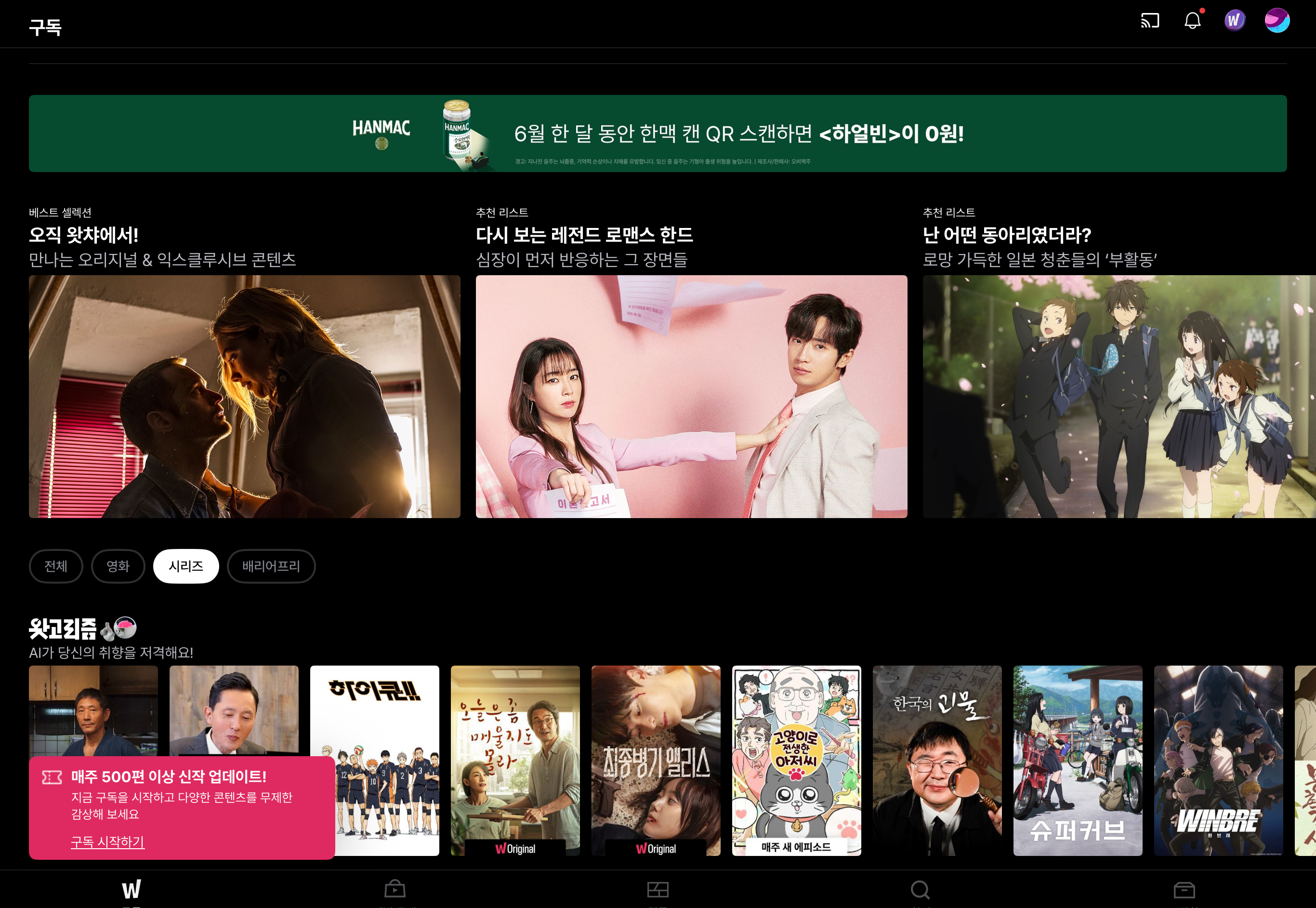 왓챠 메인 화면에 들어가서 화면을 천천히 아래로 스크롤하다보면