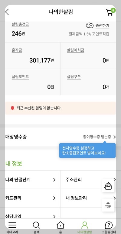 그런 후 스타벅스, 이마트, 한살림 등 자주 가는 매장 앱에서 종이영수증 대신 전자영수증 받도록 설정했어요.