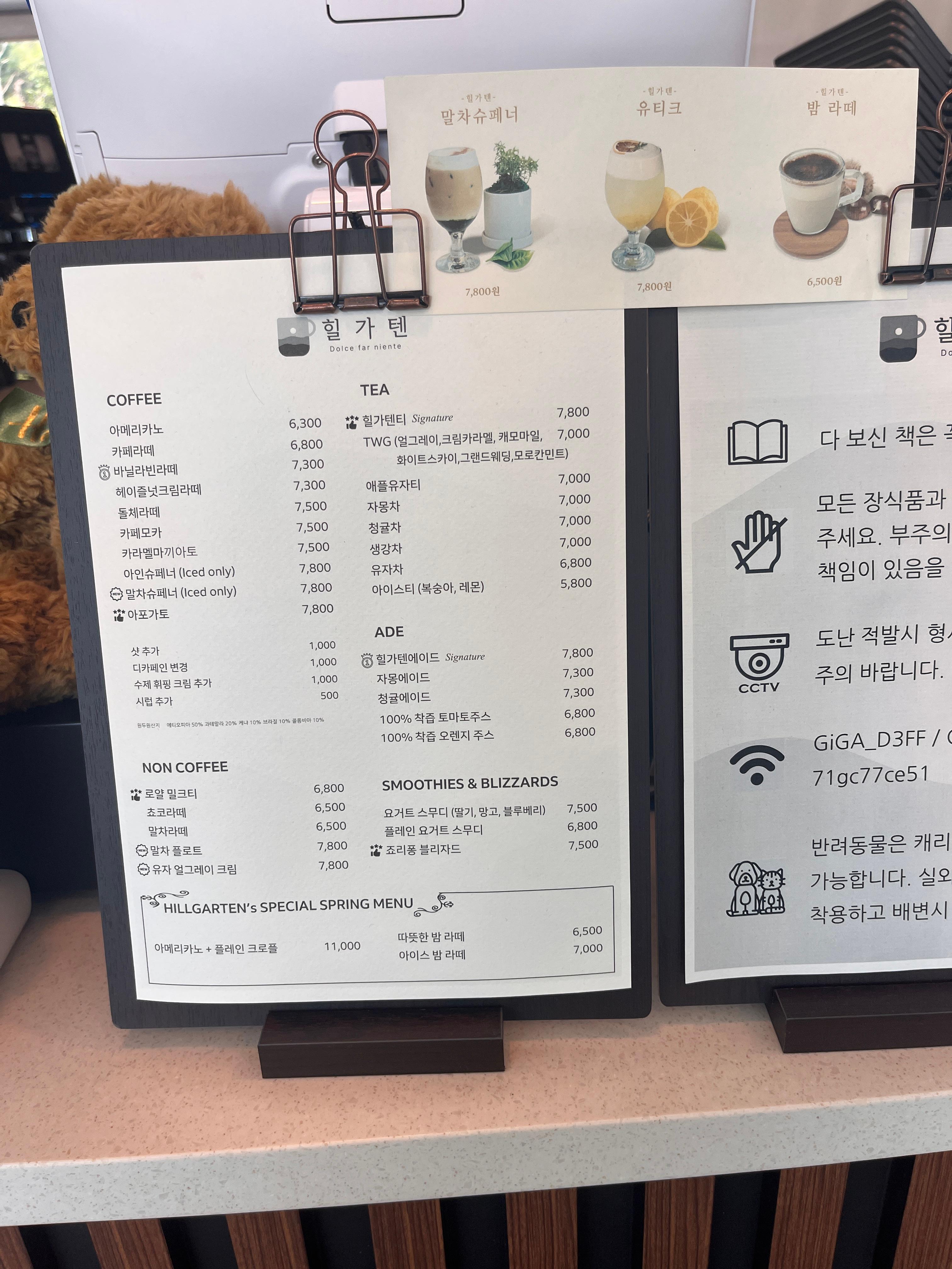 인기메뉴: 바닐라빈라떼, 말차슈페너, 아보가토, 로얄밀크티, 말차 플로트, 유자 얼그레이 크림, 힐가텐티 등
