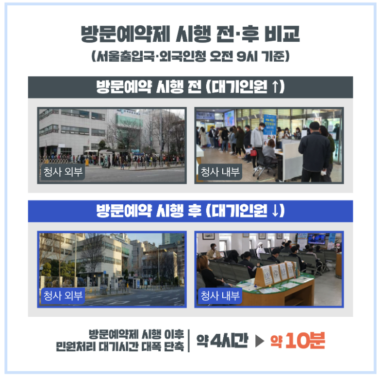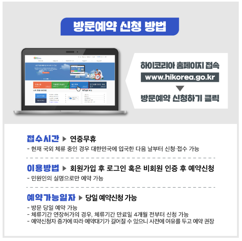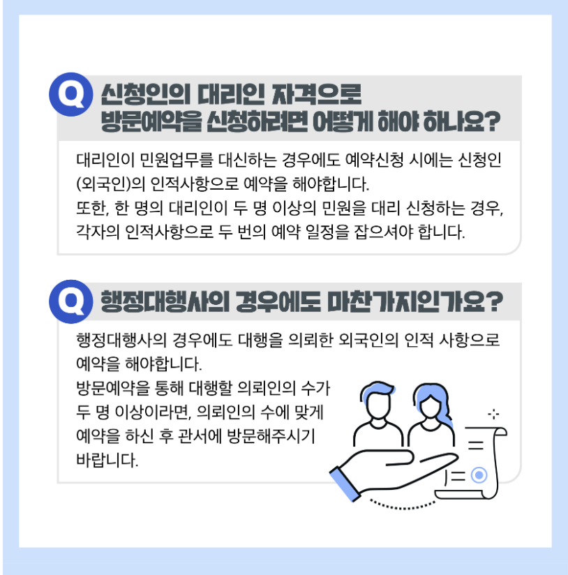 - 재입국허가, 체류자격 변경이나 다른 이민 업무 시에도 동일한 프로세스 진행 (신청→예약→방문)