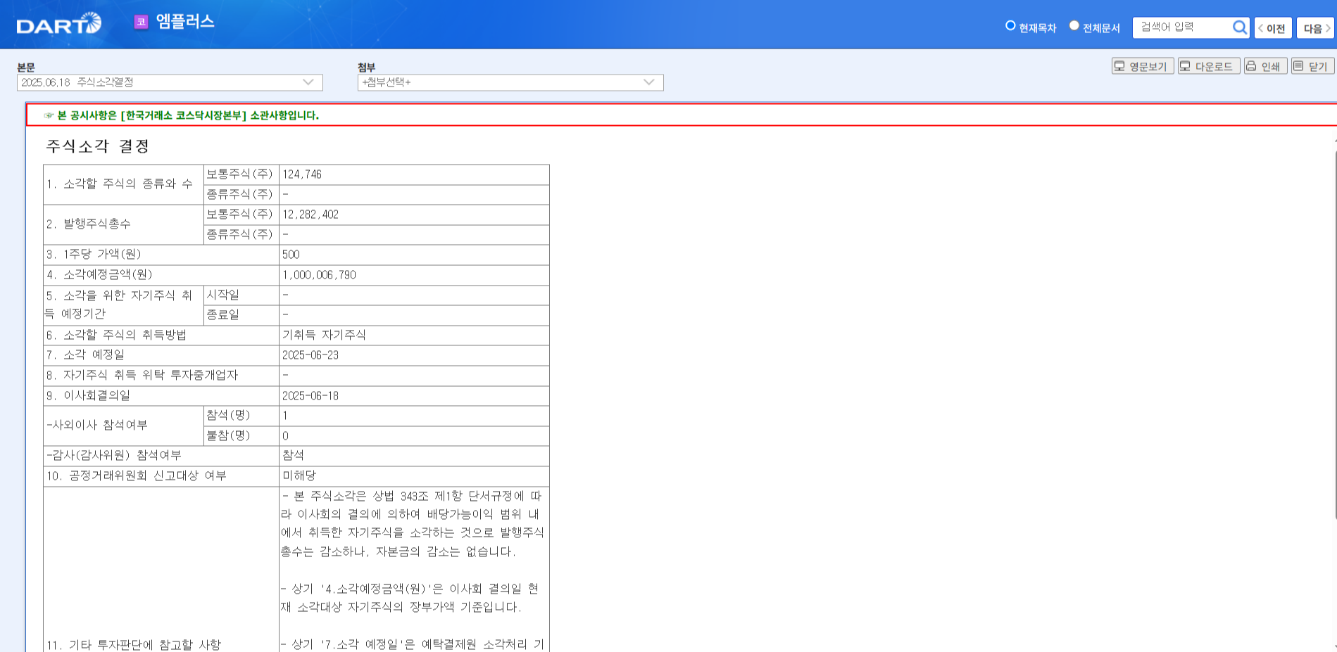 여기서 예시로 6월 18일에 '10억원 규모의 자사주 소각하기로 결정했다고 공시한 엠플러스를 살펴볼게요.