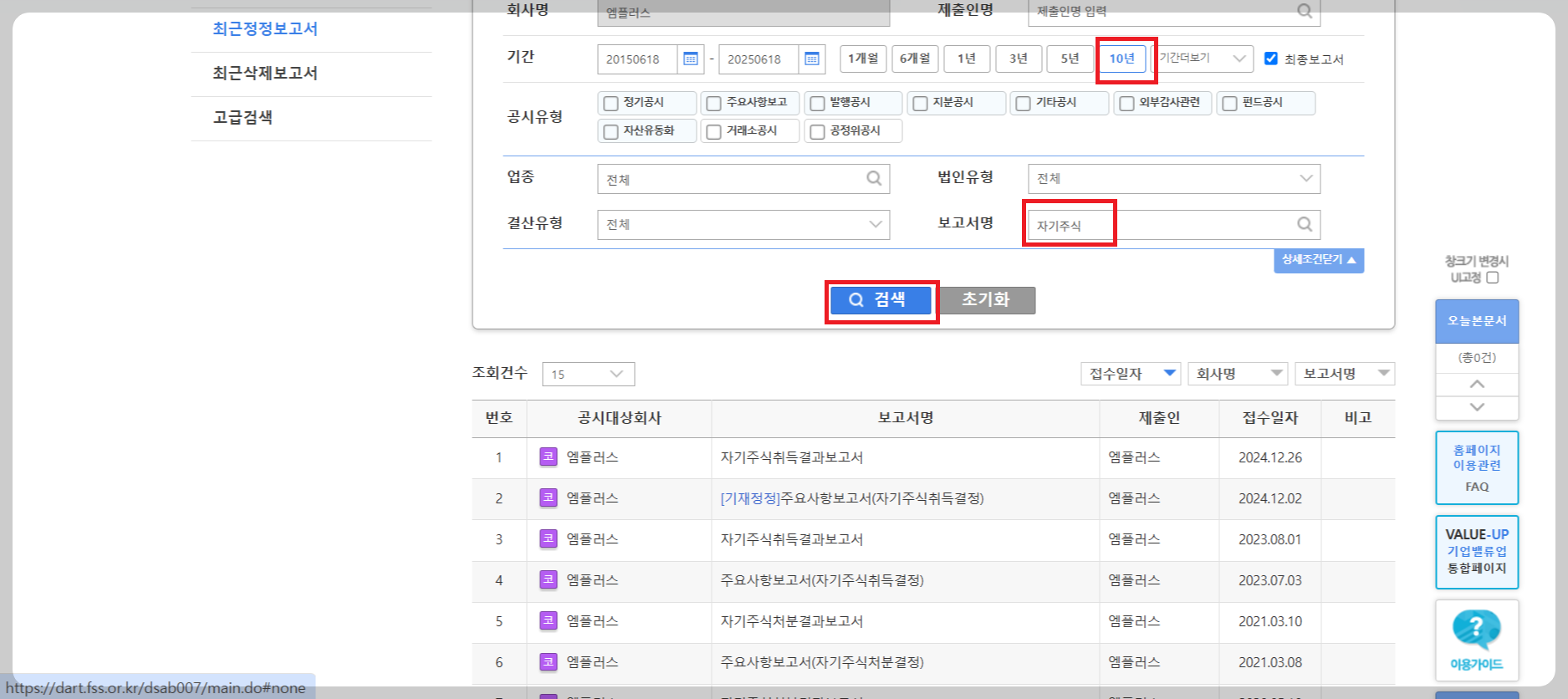 그런 후, 보고서명에다 '자기주식'이라고 입력한 후, '검색'을 눌러줬습니다.