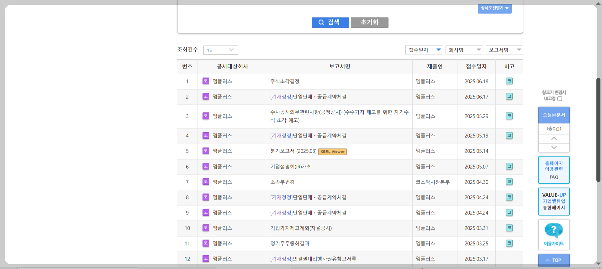 코스닥 상장되어 있는 '엠플러스'를 선택해서 조회하자, 접수일자 2025.06.18에 뉴스에 나온대로 [주식소각결정] 보고서가 떠있습니다.