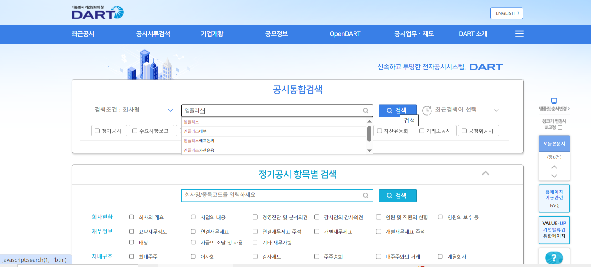 다트로 이동해서 하나의 기업을 예로 들어 조회를 해볼게요.