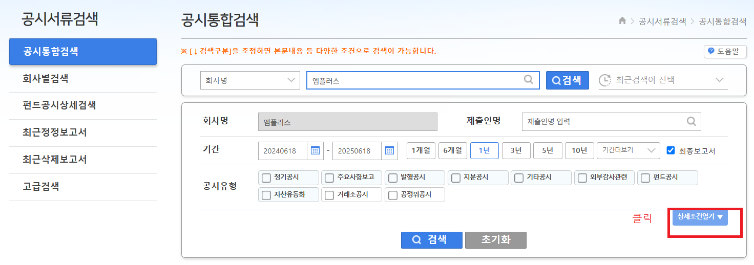 이를 알아보기 위해 아래 화면에서처럼 '상세조건열기'를 클릭해주고요.