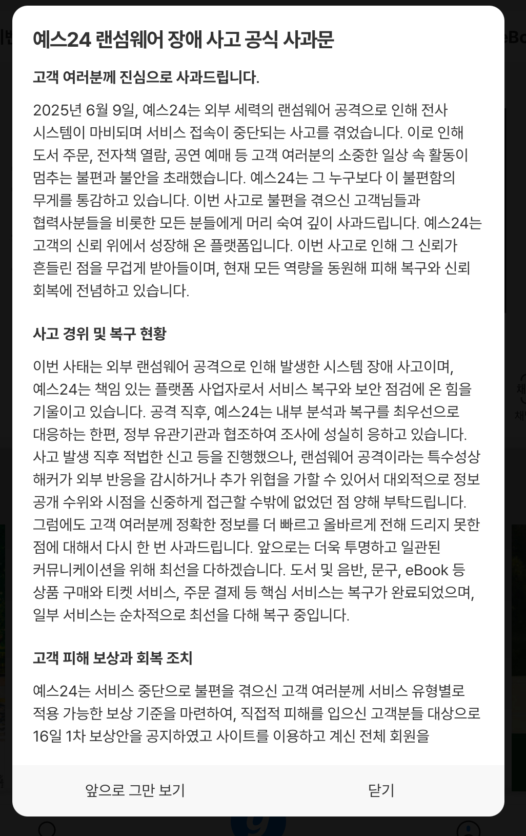 실제로 예스24는 이번 공격으로 사이트 전체가 며칠 동안 마비됐고, 이용자 불편이 엄청났죠. 회사 입장에서는 금전적 손실뿐 아니라 신뢰도 타격도 클 수밖에 없어요.