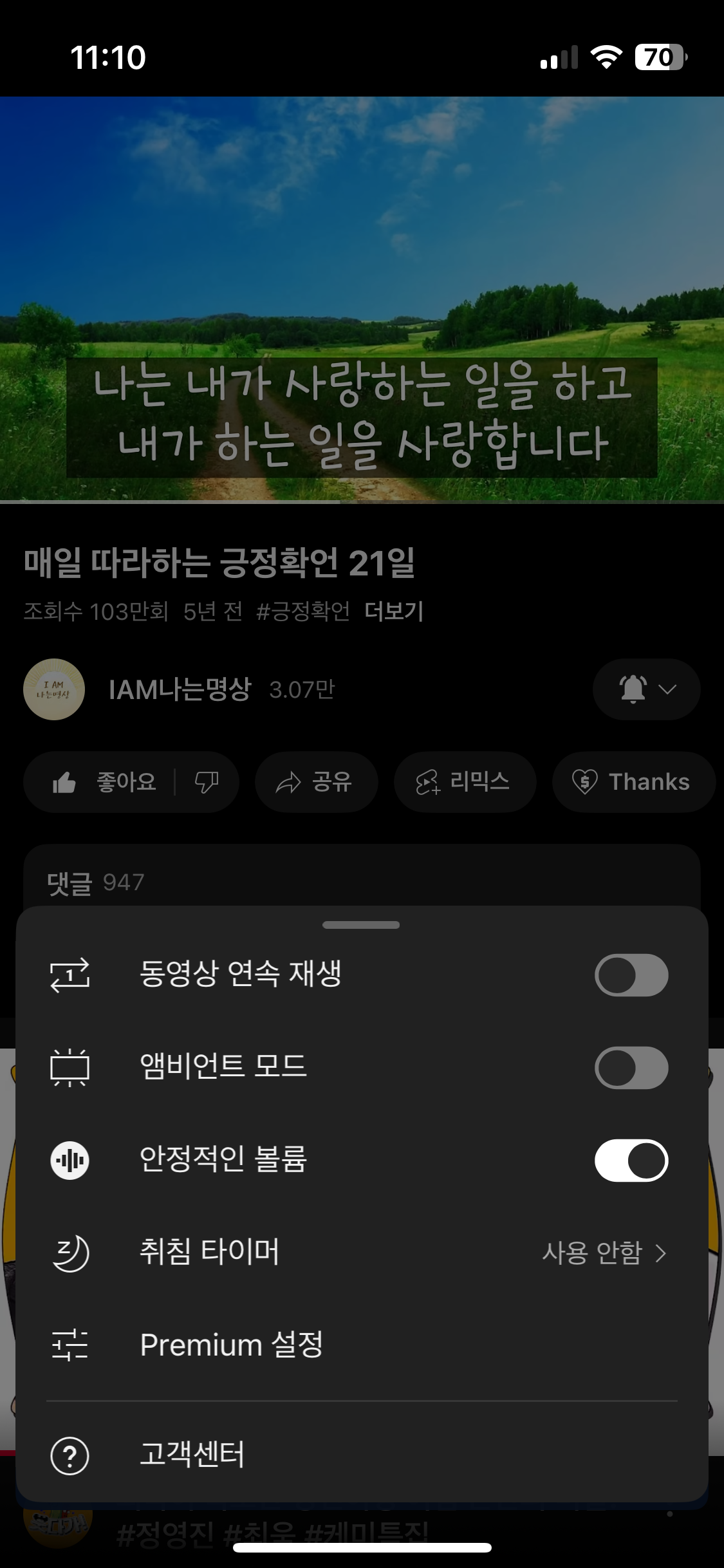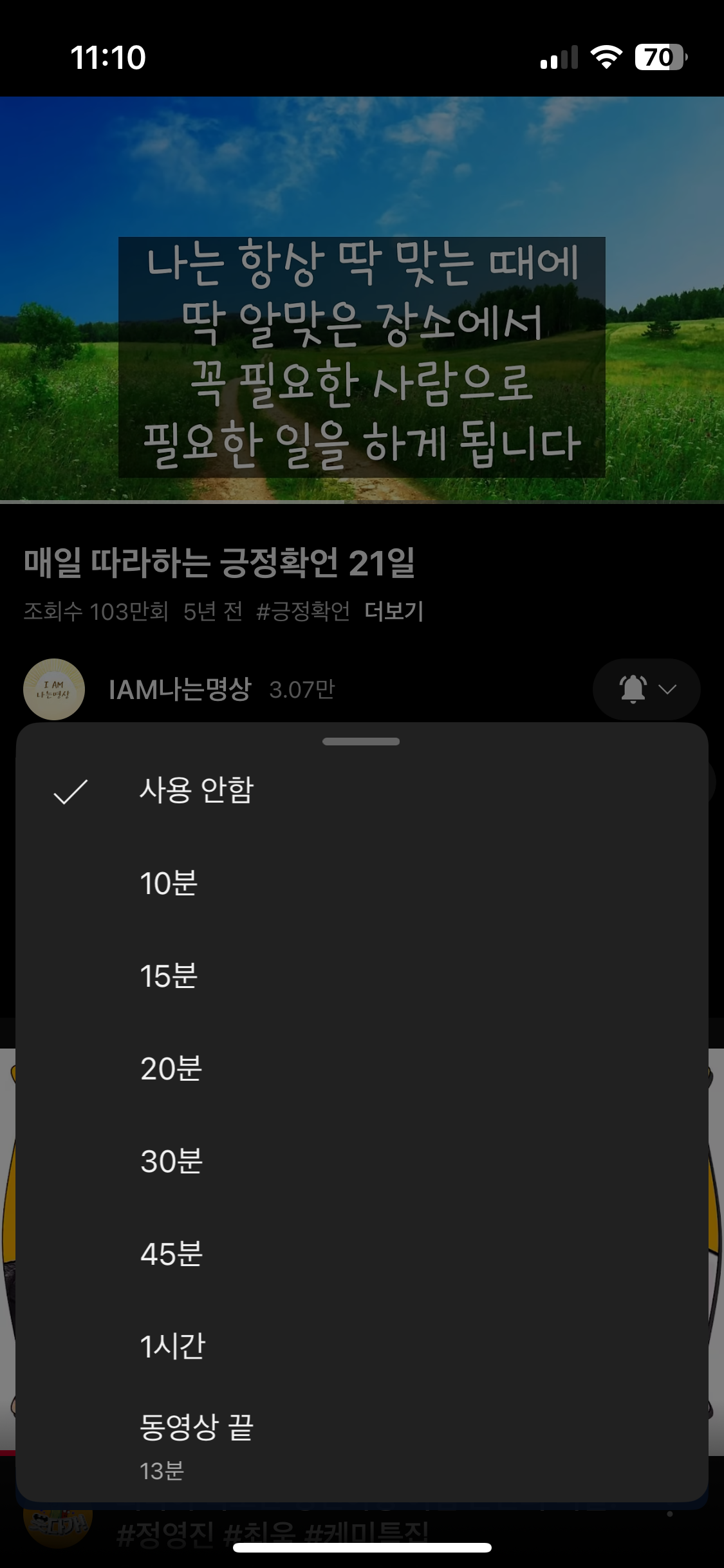 10분, 15분, 20분 ~1시간 까지 설정을 할 수 있고요, 해당 동영상까지만 재생하고 멈추게 하려면 [동영상 끝]을 선택해주시면 되세요. 그 글자 아래에 보시면 시간이 나와있죠~ 이건 현재 동영상이 끝날 때까지 남아있는 시간을 의미해요~