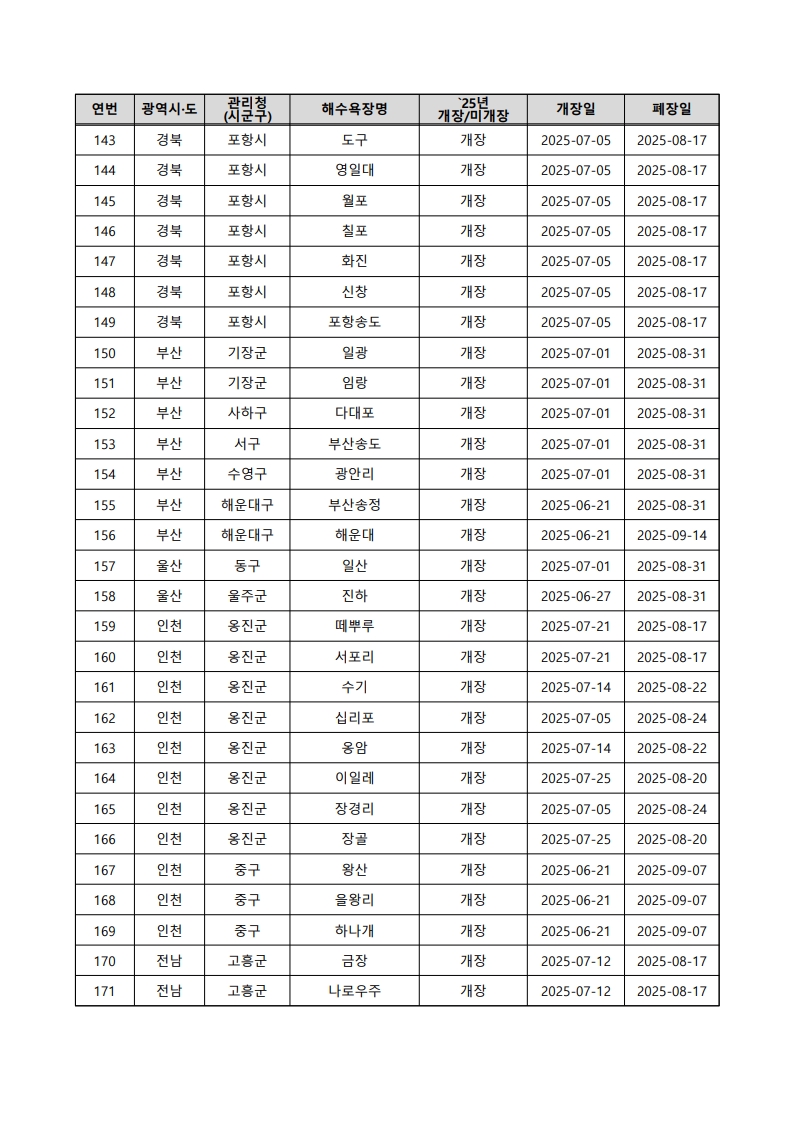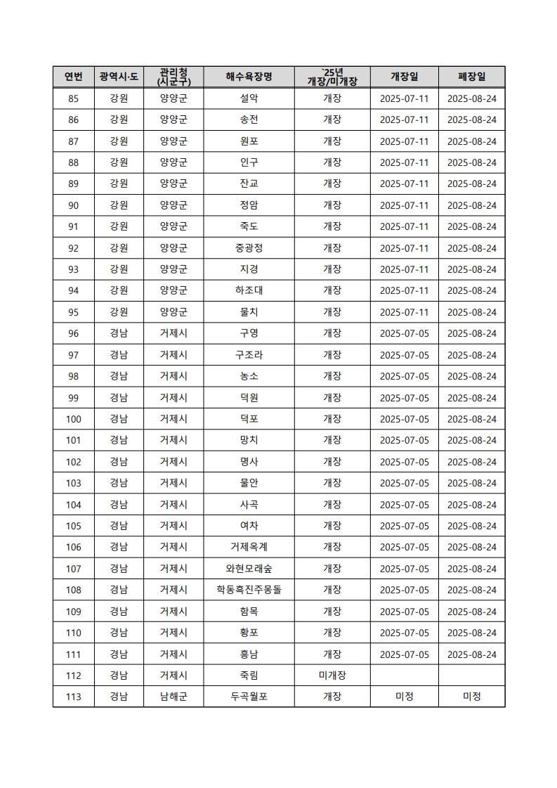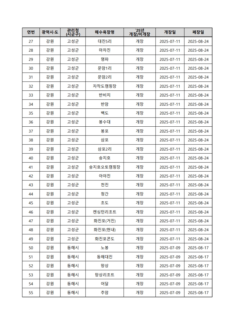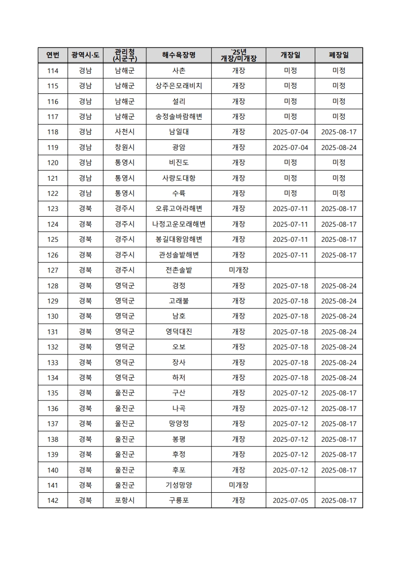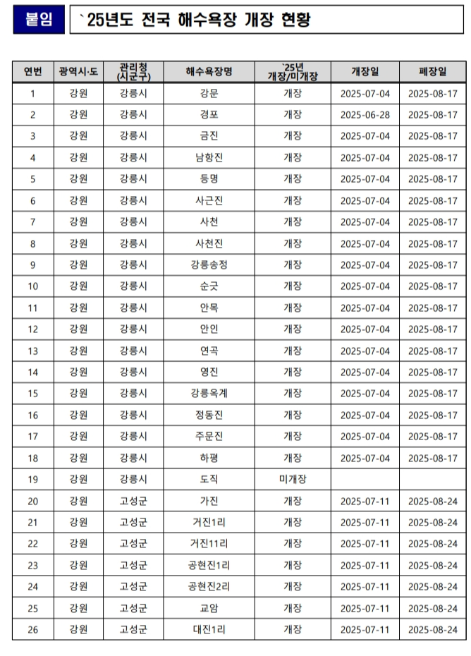 '25년도 전국 해수욕장 개장 현황 출처 : 해양수산부