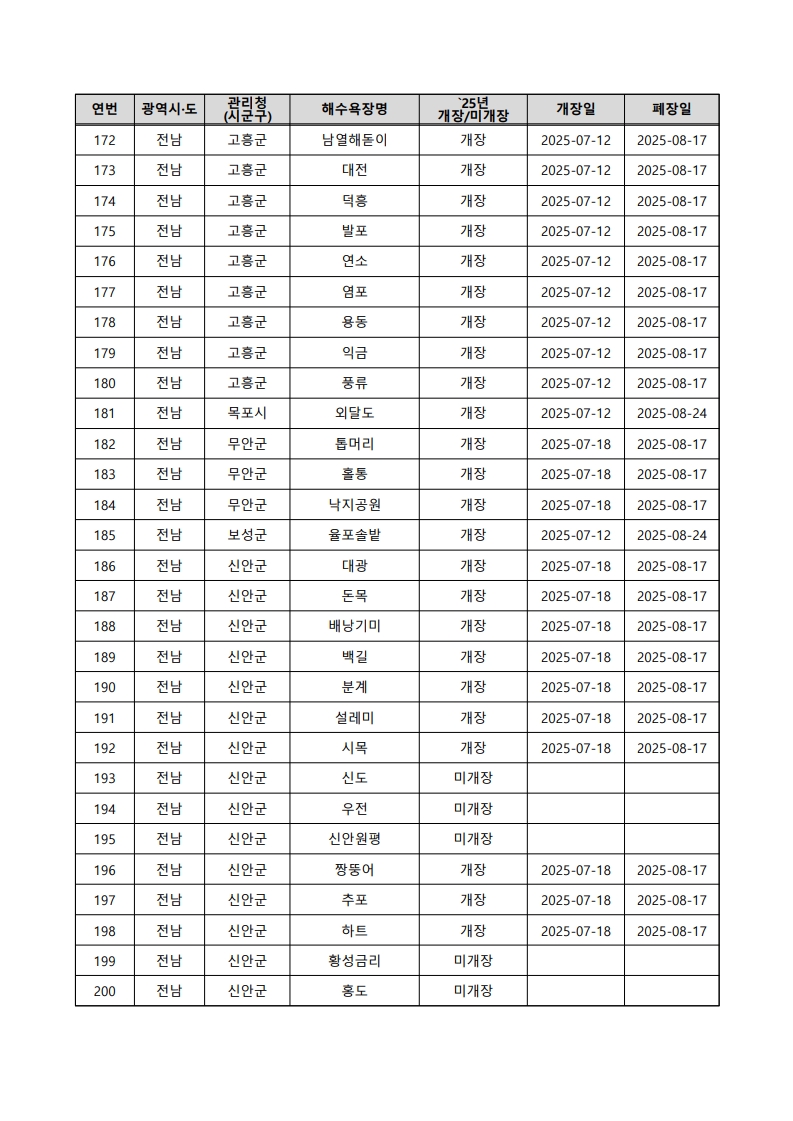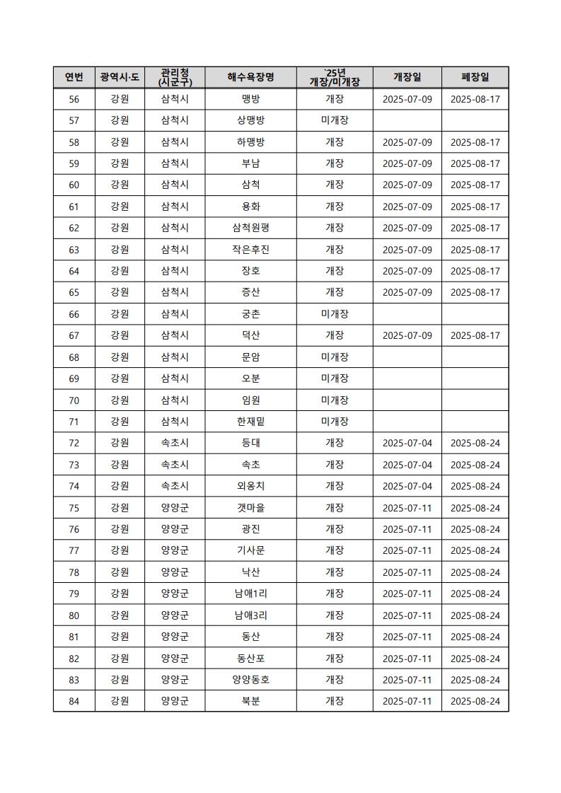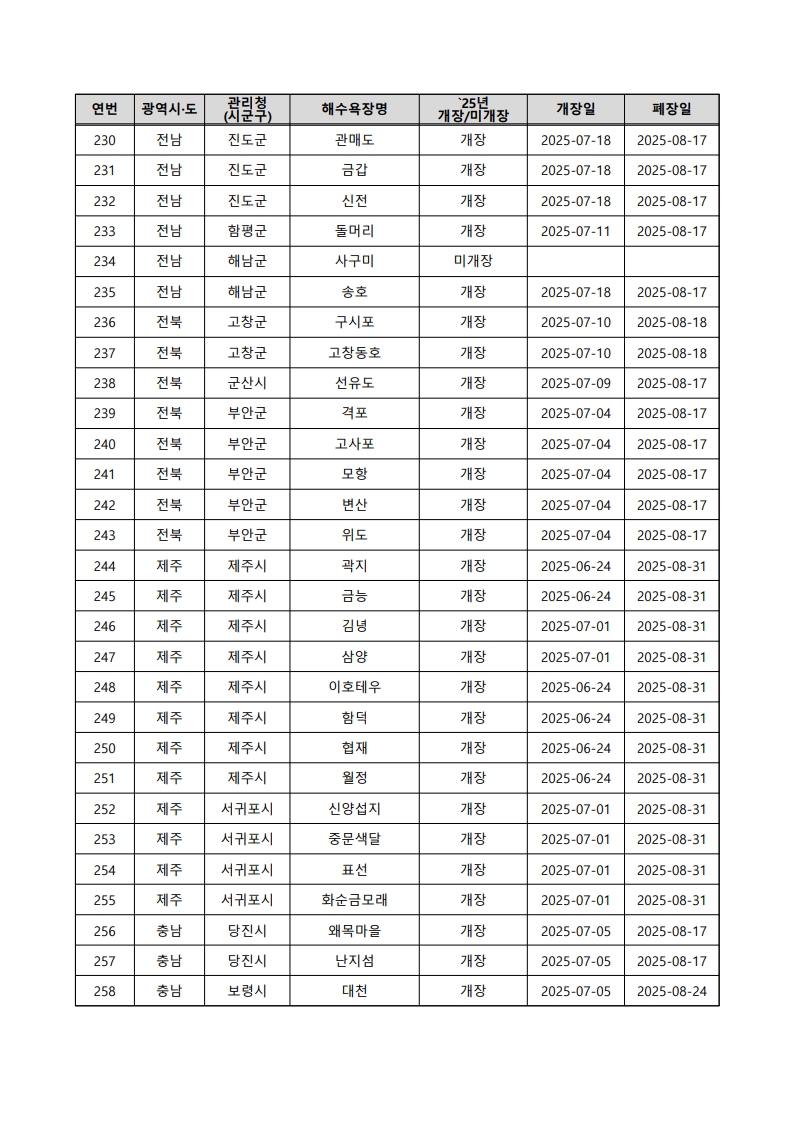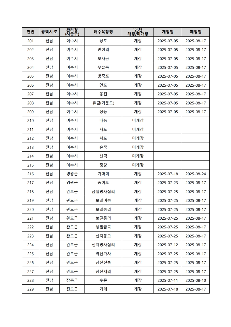 '25년도 전국 해수욕장 개장 현황 출처 : 해양수산부